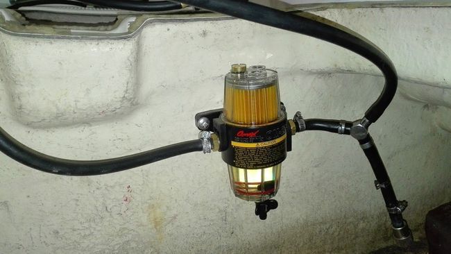 Топливный фильтр устанавливается в топливную систему двигателя и очищает топливо от возможных примесей и водного конденсата, скапливающегося в топливных баках. Оборудован прозрачным отстойником с плавающим кольцом-индикатором, позволяющим с лёгкостью определить уровень отфильтрованной воды, а сливной болт даёт возможность слить отфильтрованную воду без демонтажа самого фильтра. − Тип жидкости: бензин. − Пропускная способность: 117 л/ч. − Фильтрующий элемент: 10 мкм. − Сечение шланга, мм. 9. − Габариты, мм. 230х150х90.
