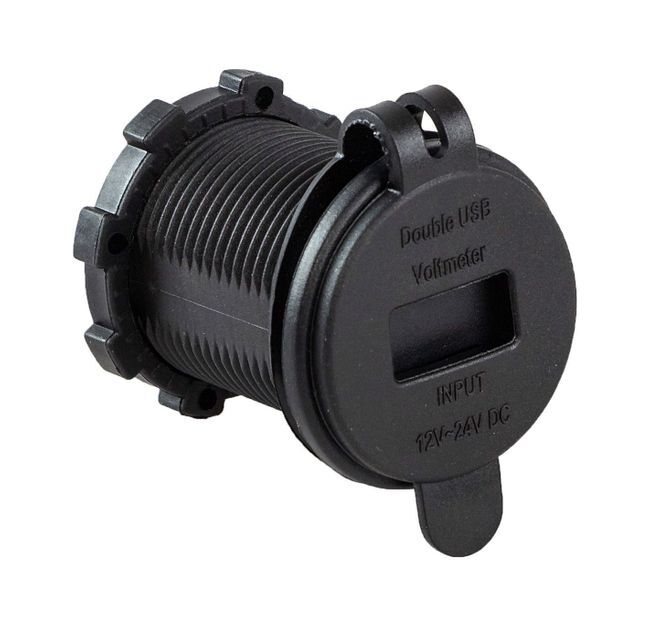 Врезной USB разъем на два порта плюс цифровой вольтметр. Служит для питания и зарядки электронных гаджетов, а также для контроля напряжения бортовой сети. Изготовлен из высокопрочного пластика. Для защиты разъемов от пыли и брызг комплектуется резиновой крышкой. При подключении прибора к бортовой сети, следует обратить внимание на полярность подключения контактов.
