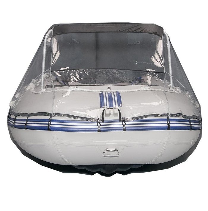 Тент прозрачный и выглядит как стекло. Особенно такой тент могут оценить хозяева надувных лодок. которым нельзя ставить утяжеляющие конструкции, и за счет легкости лодки, большое количество брызг от воды попадает на пассажиров, а тент сможет эту ситуацию надежно исправить и укрыться. Не имеет большого веса, легко крепится, удобно моется.
